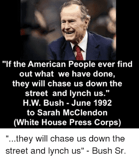 And still, Bush was the least obnoxious Republican president we have had since the new conservative era began, with Ronald Reagan. Reagan was way more destructive and he really hurt working people. Bush’s son, George W. Bush was an idiot a really stupid person and he was also a war criminal—like father, like son. And compared to Donald Trump—we can say he wasn’t total jack ass. H W was just a lot easier to tolerate. He seemed like a nice guy. It would seem a person can be a bloody imperialist and still seem like a nice guy.
